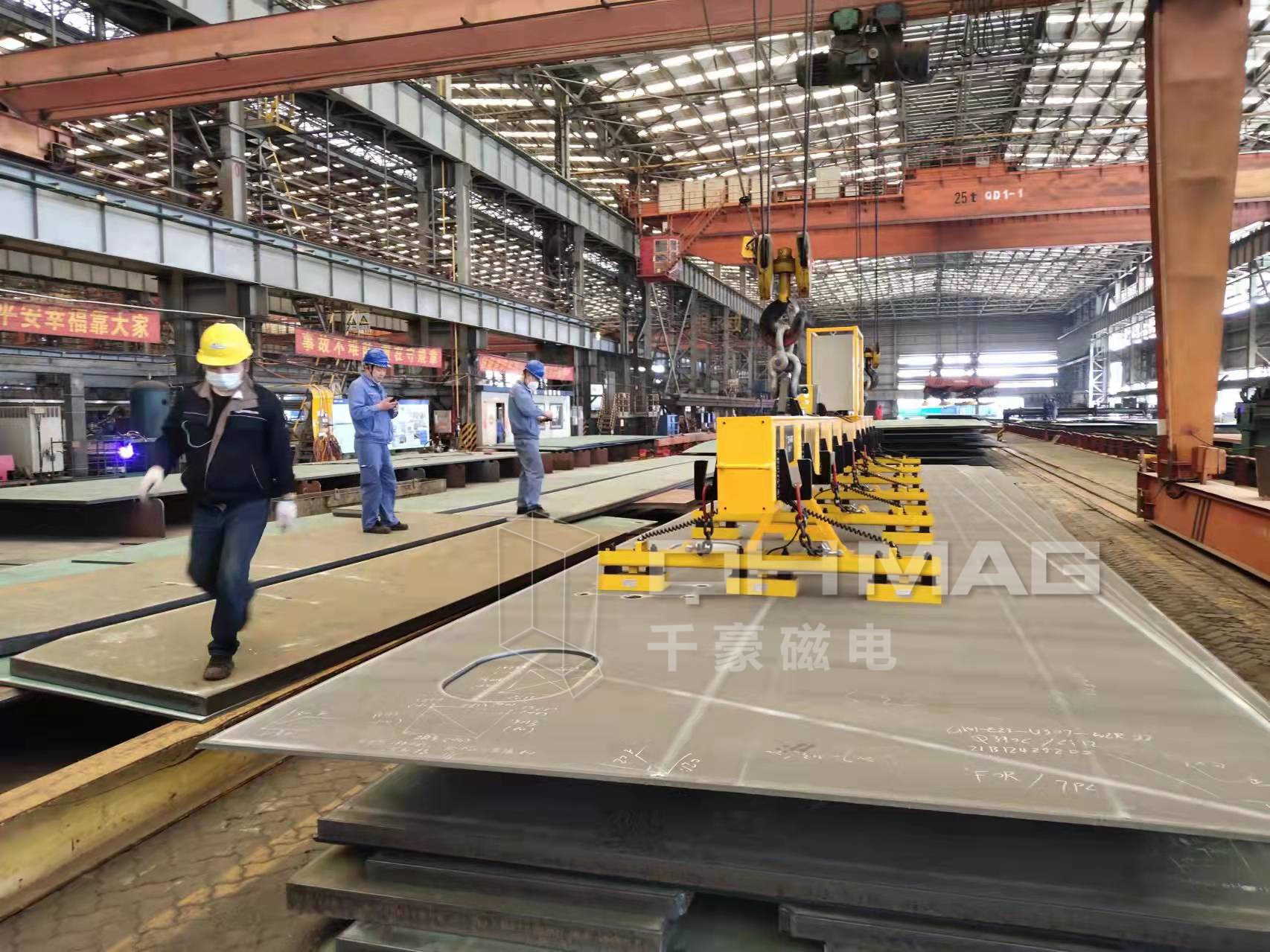 本次設(shè)計(jì)的電永磁吊具——吊鋼板,主要用于廣船國際造船用的鋼板搬運(yùn)起吊,千豪設(shè)計(jì)團(tuán)隊(duì)了解到現(xiàn)場需要起吊厚鋼板,薄鋼板,長度以及重量都不一,最長10米,最重達(dá)到40噸。