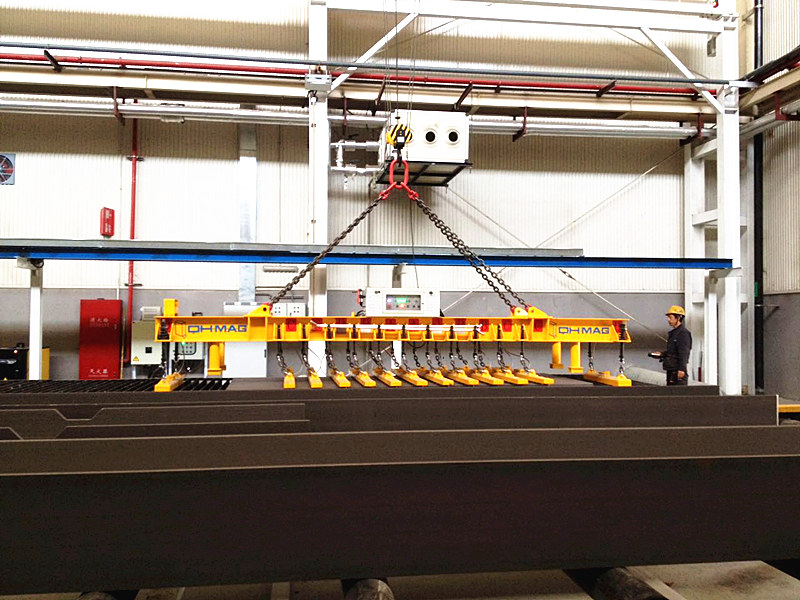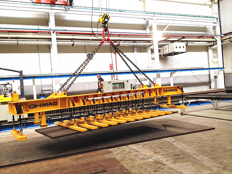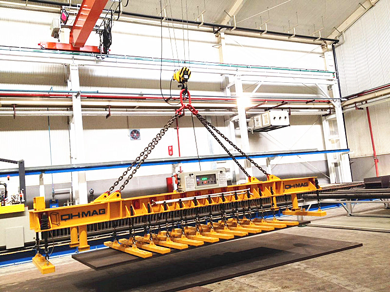 湖南千豪鋼板上下料切割線用電永磁吊具屬于鋼板吊具的一種:鋼板切割線(火焰切割、等離子切割、激光切割等)的上下料,通常要求上料時(shí)只吊運(yùn)一張整板,切割完后,所有切割工件一次性或盡量多的從切割臺(tái)上吊運(yùn)下來(lái),針對(duì)這一要求,千豪磁電研發(fā)了矩陣式和密布式電永磁吊具系統(tǒng)。