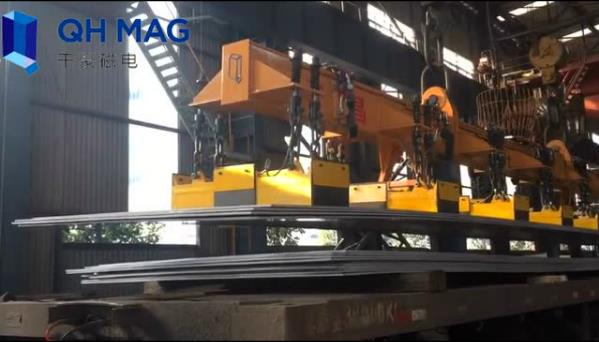 中厚板多張起吊可以采用電永磁吊具,湖南千豪可根據客戶需求定制解決方案,其產品設計具有調磁功能,吸料時調節(jié)電壓即可滿足單張多張切換起吊。吸吊鋼板時,采用調磁保磁控制設備;在起重電磁鐵所吊物料運行至指定位置過程中,如遇電網停電或主整流部分故障;或人為關掉電源,備用電源立即自動投入,以保證被吸物料不致落下;以防砸壞設備、傷及人員等發(fā)生安全事故。